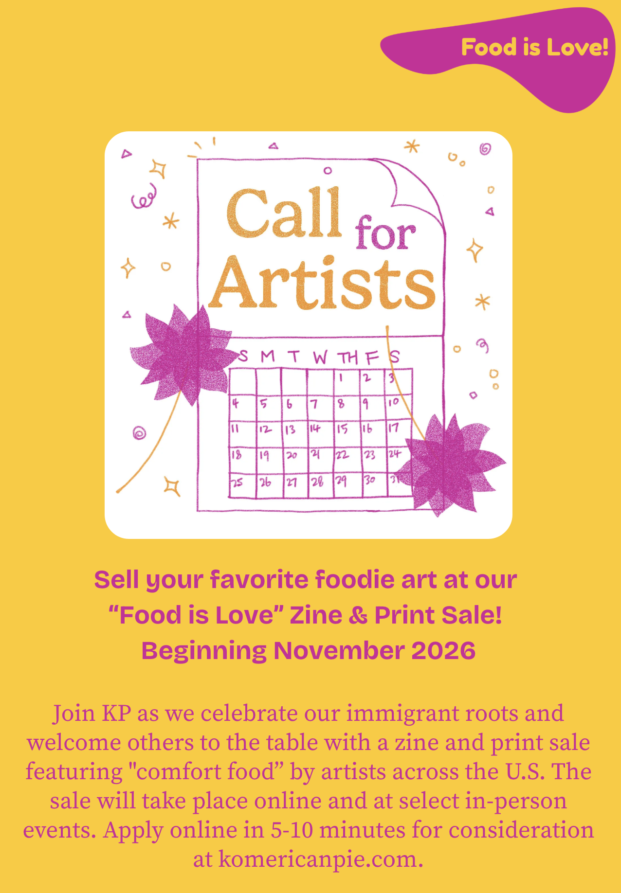 At Komerican Pie, we recognize the power of food as a love language, vehicle for connection and a universal human bond - we all gotta eat! In April 2025, Komerican Pie put out a national Call for Artists to participate in its first-ever “comfort food” art calendar project. We received a bountiful response from beautiful artists across the country who helped make this calendar with heART! You can flip through the calendar below.